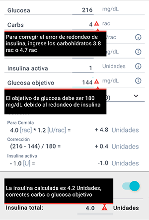 Desafortunadamente, algunas plumas de insulina no permiten administrar insulina con una precisión de 0.1 e incluso 0.5 unidades. En tales casos, la insulina administrada es un número entero y la insulina calculada debe redondearse al número entero más cercano. En caso de redondeo hacia abajo o hacia arriba (la insulina será menor o mayor de lo necesario), el nivel objetivo de glucosa cambiará, lo que puede ser significativo en caso de alta sensibilidad a la insulina. En este caso, el asistento de bolo mostrará un error en los cálculos y sugerirá compensar la insulina faltante (o excedente) cambiando la cantidad de carbohidratos consumidos o ajustando el nivel objetivo de glucosa.