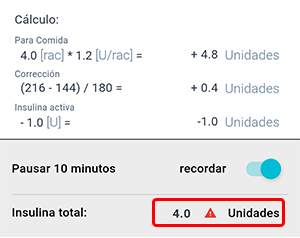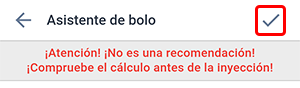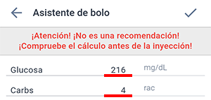 ¡Atención! El Asistente de bolo no es una recomendación, prescripción o tratamiento, y se utiliza exclusivamente con fines informativos, para facilitar los cálculos. ¡Siempre verifique los datos que ha ingresado y calculado con el asistente!