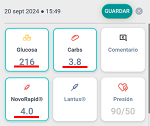 1. Administrar 5 unidades de insulina, consumir 4 raciones de CH, el nivel objetivo de glucosa corregido será 216 mg/dL.