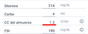 Por ejemplo, si el coeficiente de carbohidratos es 0.7, esto significa que para absorber 1 ración de CH se necesitan 0.7 unidades de insulina en bolo, y para absorber 3 raciones se necesitan 0.7 * 3 = 2.1 [U] de insulina "para la comida".