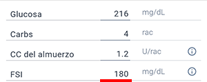 Por ejemplo, si el FSI es de 180 mg/dL, esto significa que al administrar 1 unidad de insulina, la glucosa disminuirá en 180 mg/dL, y al administrar 1.5 unidades de insulina, la glucosa disminuirá en 1.5 * 180 = 270 [mg/dL].