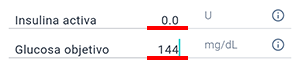 La "Glucosa Objetivo" es el nivel de glucosa deseado al que el usuario aspira al administrar insulina. La glucosa objetivo se calcula como el promedio entre los niveles "Objetivo de glucosa alta" y "Objetivo de glucosa baja" de glucosa establecidos en la sección "Datos médicos" del perfil del usuario.