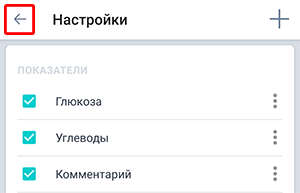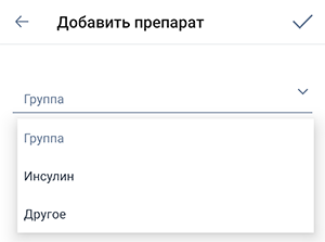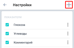 Для добавления нового показателя (инсулин или собственный препарат) нажмите символ плюса справа вверху.