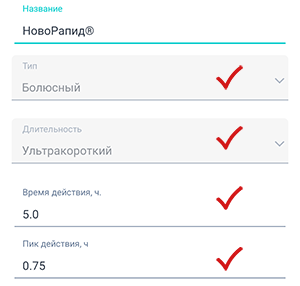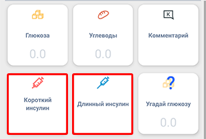 В приложении предустановлены два инсулина «Короткий» и «Длинный». При первом нажатии на эти показатели приложение предложит Вам их настроить.