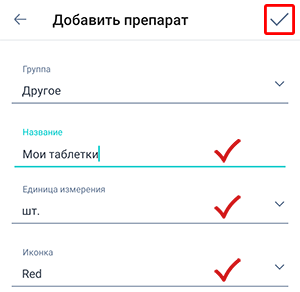 Если Вы выбрали «Другое» - введите название Вашего препарата, выберите единицу измерения и цвет иконки.