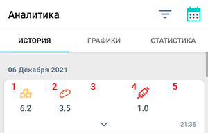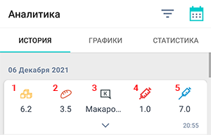 В истории записей показатели располагаются в том же порядке, что и на экране ввода данных. Пять первых показателей всегда отображаются в заданной последовательности, на определенных местах.
