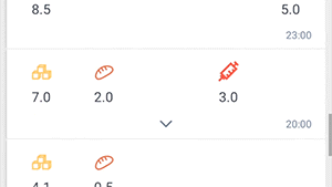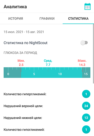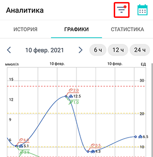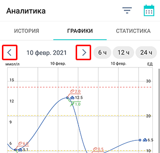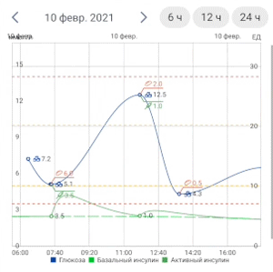 График глюкозы. Если между точками ввода глюкозы более 12 часов, то график глюкозы между ними не строится.